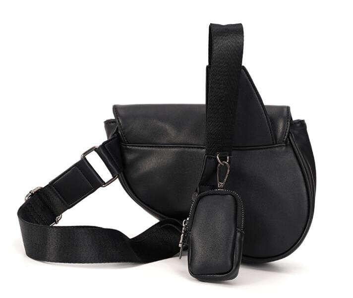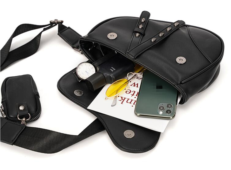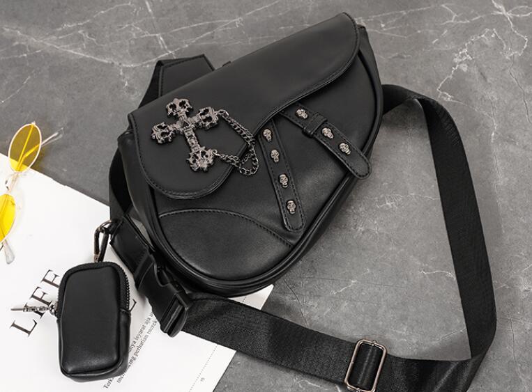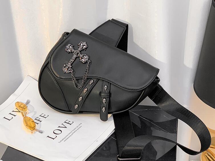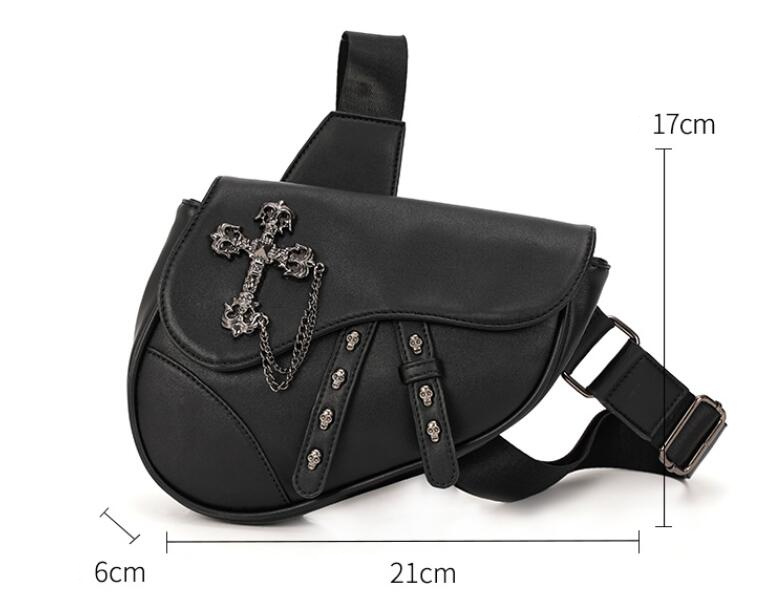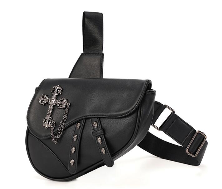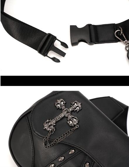 個性的な十字架のチェーンがアクセントになったブラックのウエストポーチです。